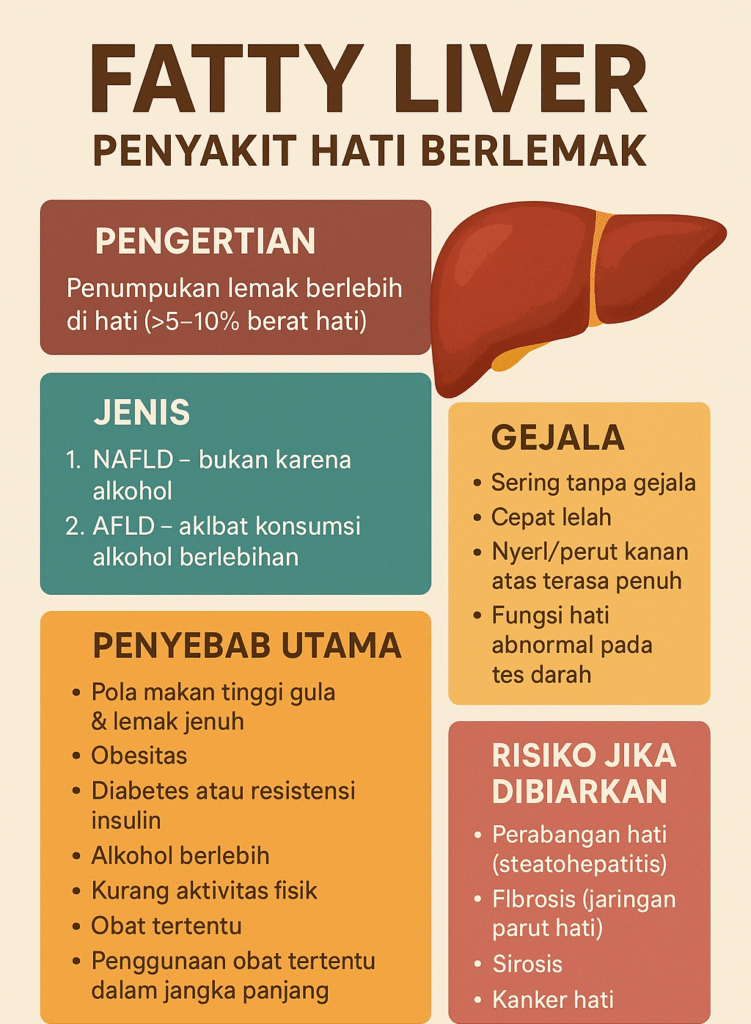 ⚠ Catatan: Fatty liver yang dibiarkan bisa berkembang menjadi peradangan hati (steatohepatitis), jaringan parut (fibrosis), bahkan sirosis yang berisiko gagal hati atau kanker hati.
